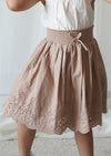 Details Loose fit, flowy skirt with elastic waist and embroidered anglaise detailing at bottom.